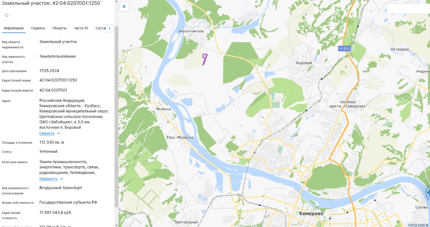 Земельный участок, пл.112330 кв.м, кадастровый №42:04:0207001:1250, разрешенное использование: воздушный транспорт. Срок аренды 88 месяцев