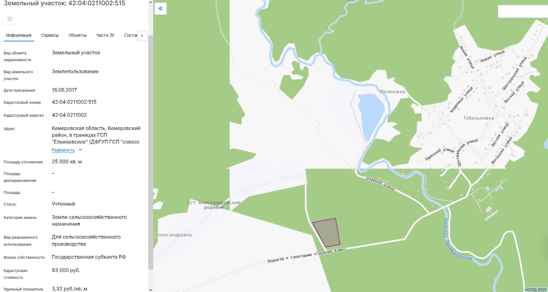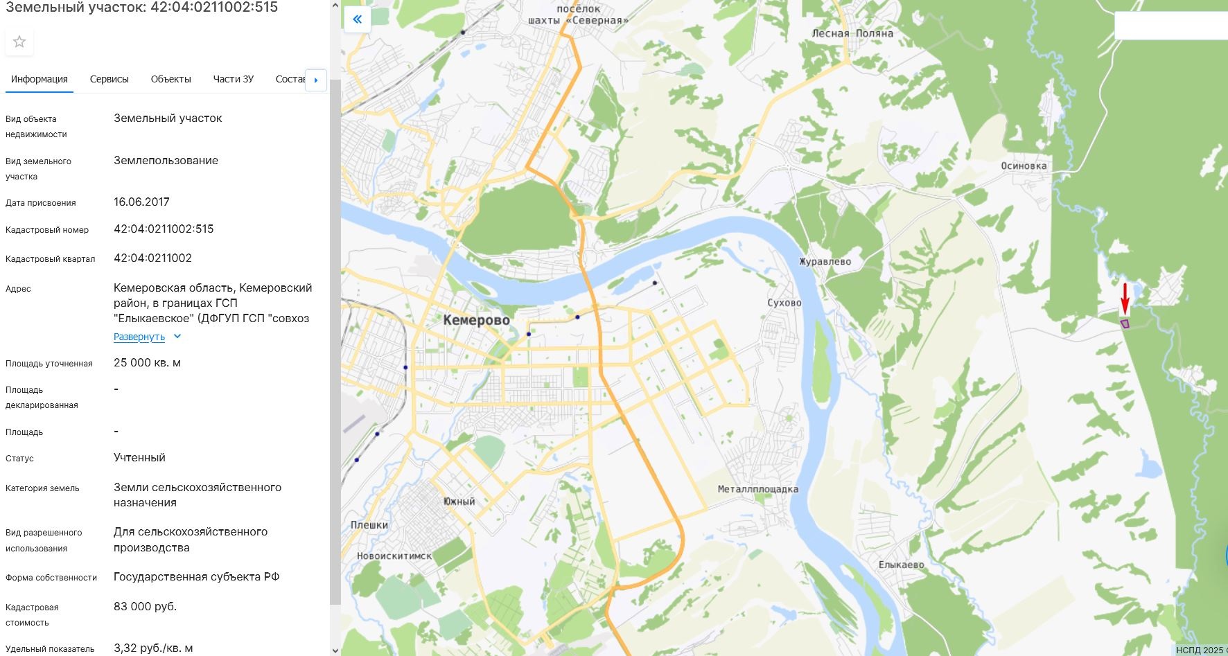 Земельный участок, пл.25 000 кв.м, кадастровый №42:04:0211002:515, разрешенное использование: для сельскохозяйственного производства. Срок аренды 5 лет