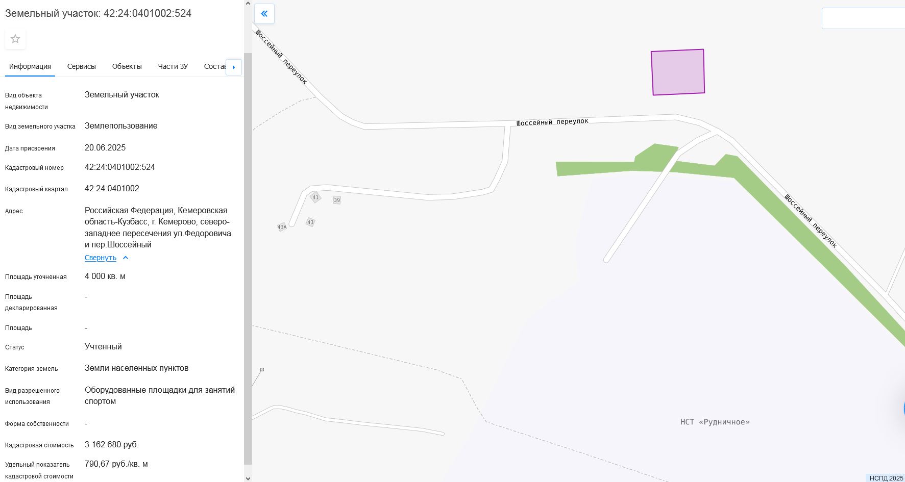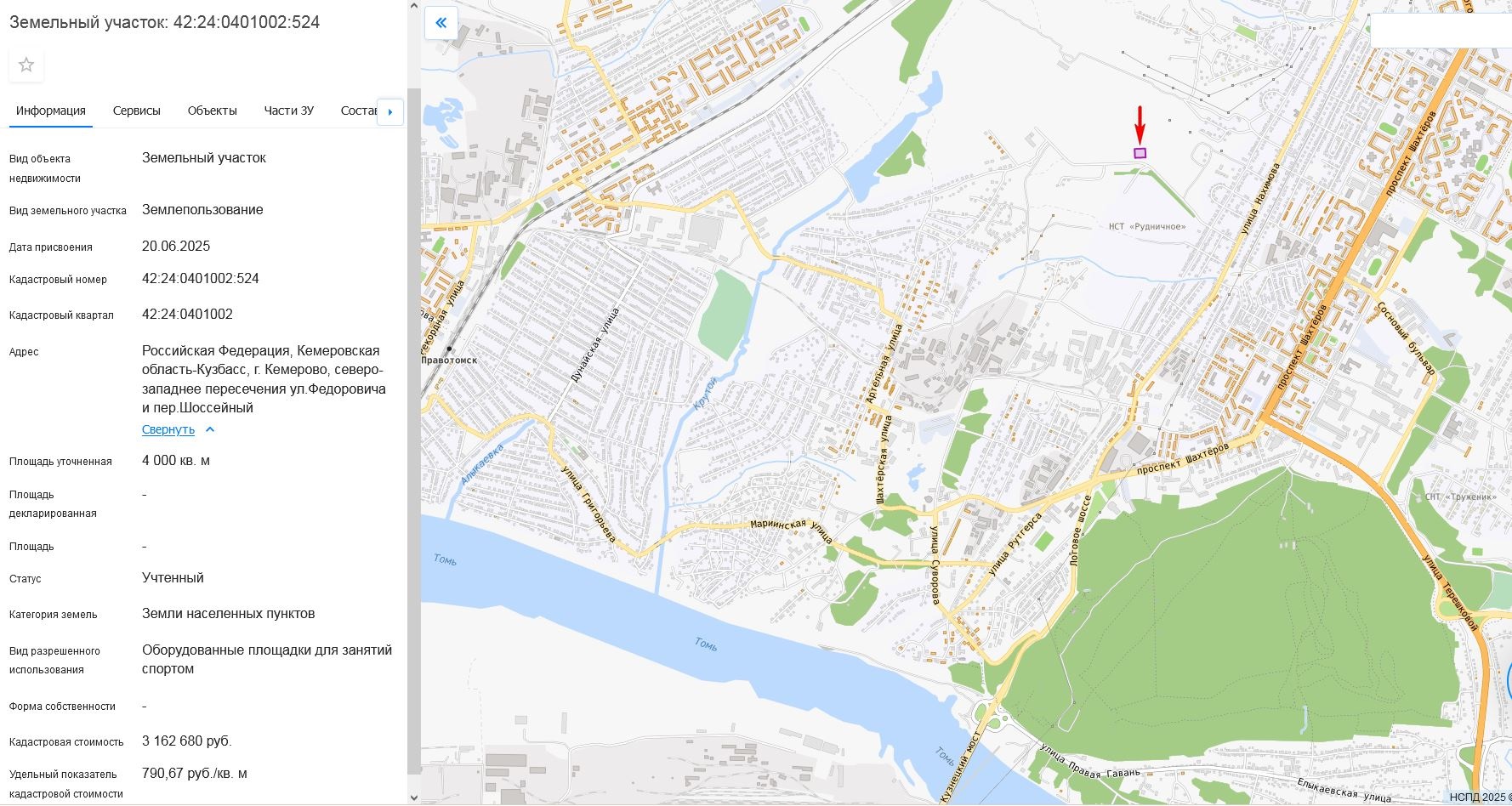 Земельный участок, пл.4000 кв.м, кадастровый №42:24:0401002:524, разрешенное использование: оборудованные площадки для занятий спортом. Срок аренды 104 месяца