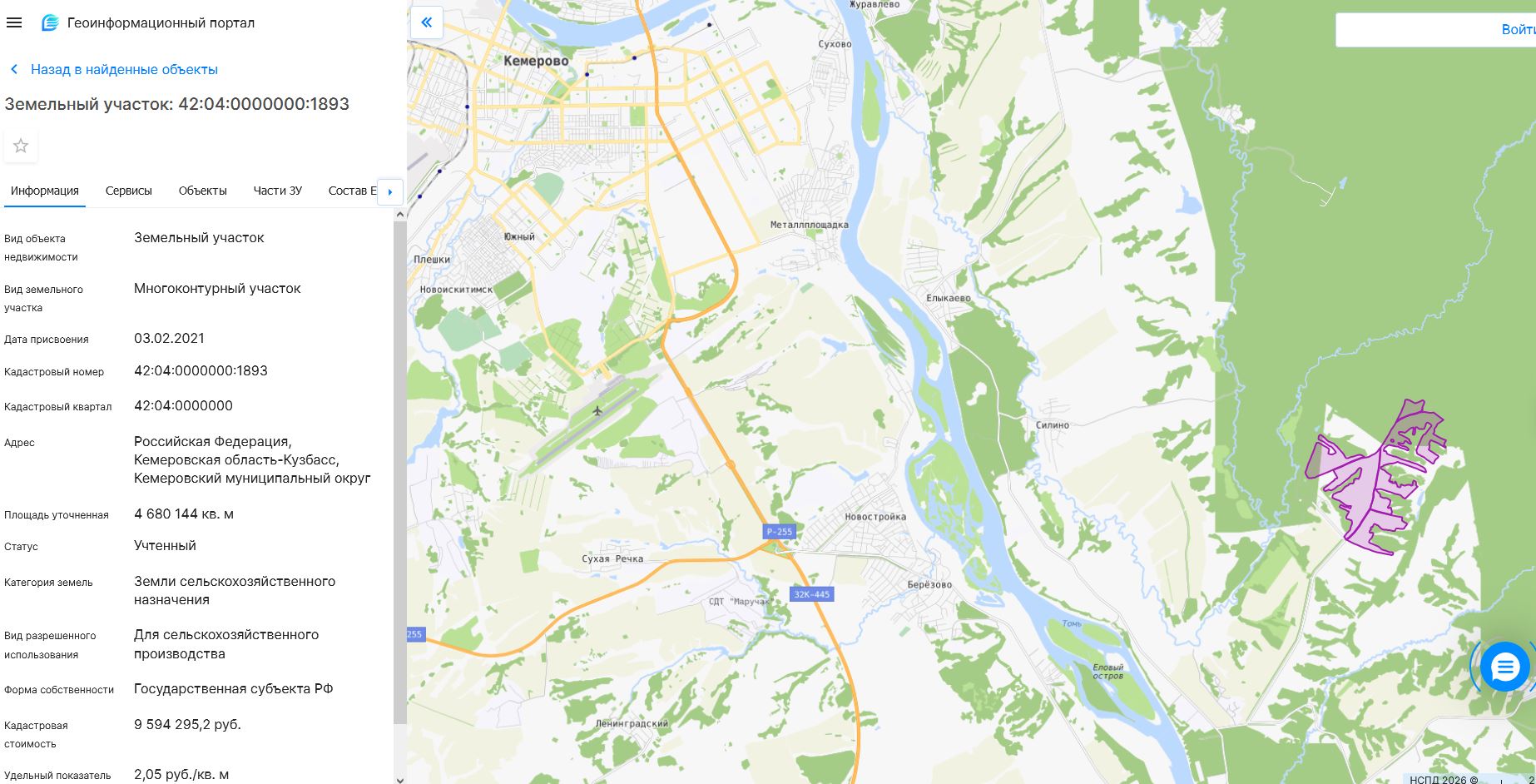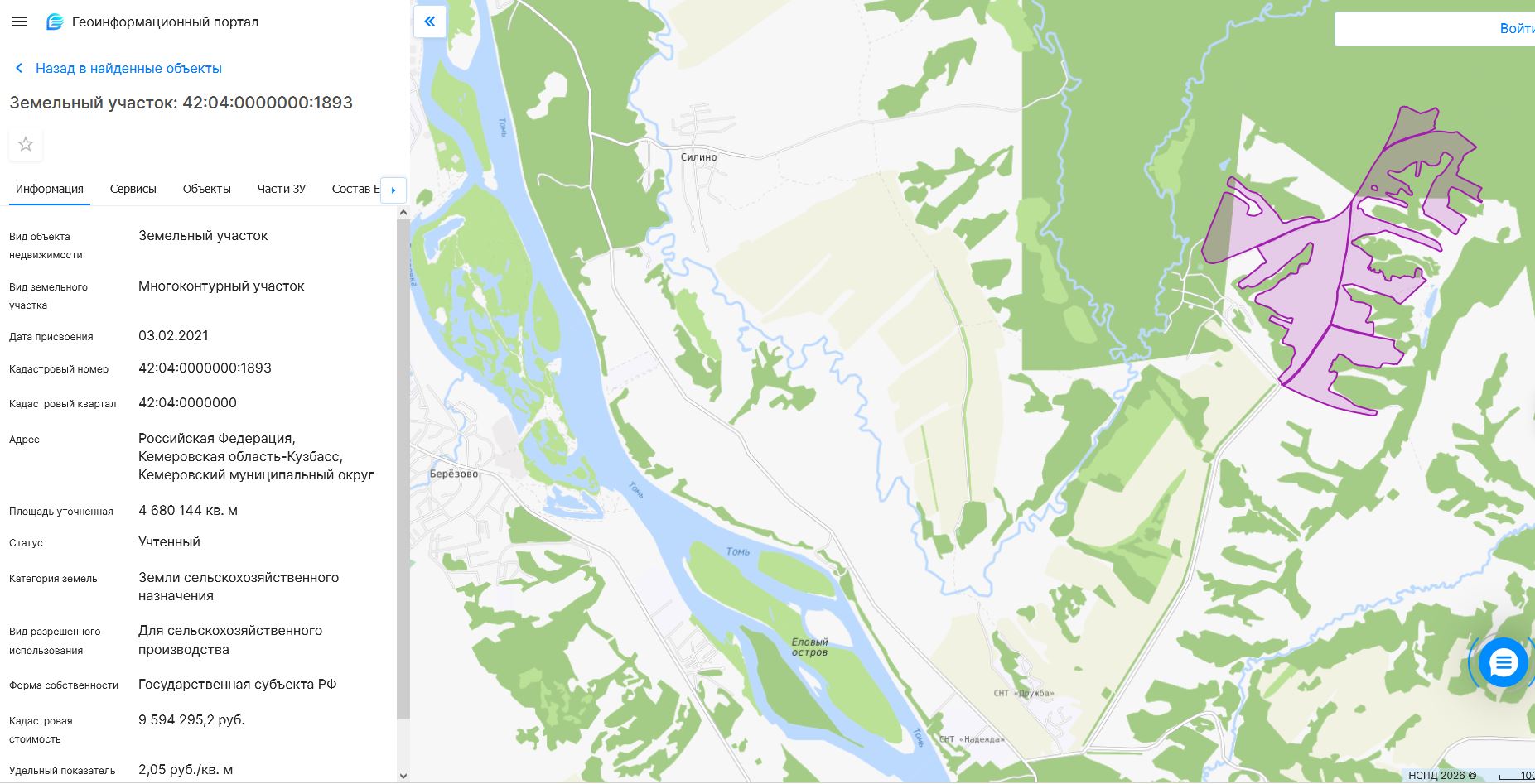 Земельный участок, пл.4680144 кв.м, кадастровый №42:04:0000000:1893, разрешенное использование: для сельскохозяйственного производства. Срок аренды 5 лет