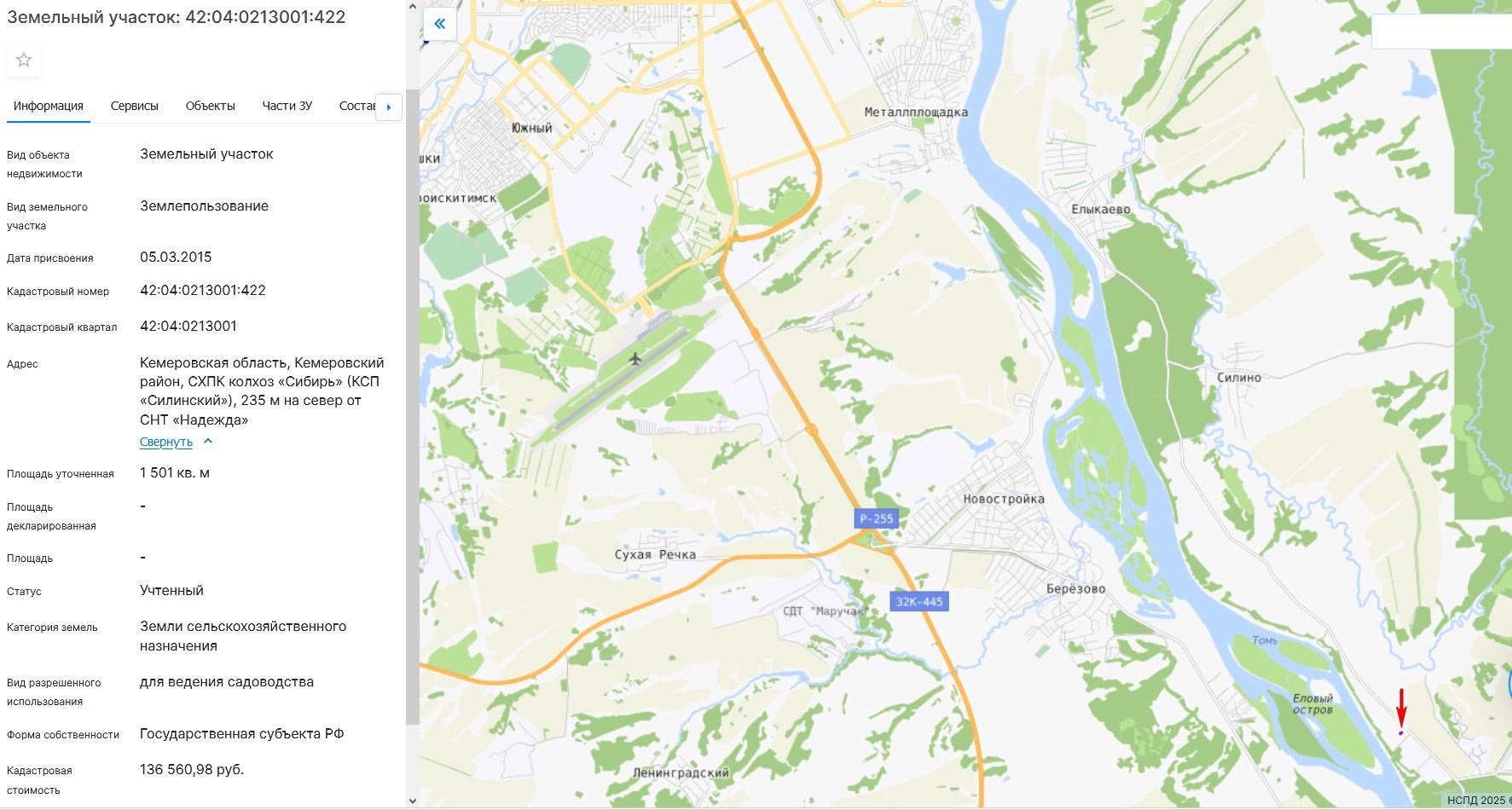 Адрес: Кемеровская область, Кемеровский район, СХПК колхоз «Сибирь» (КСП «Силинский»), 235 м на север от СНТ «Надежда»
