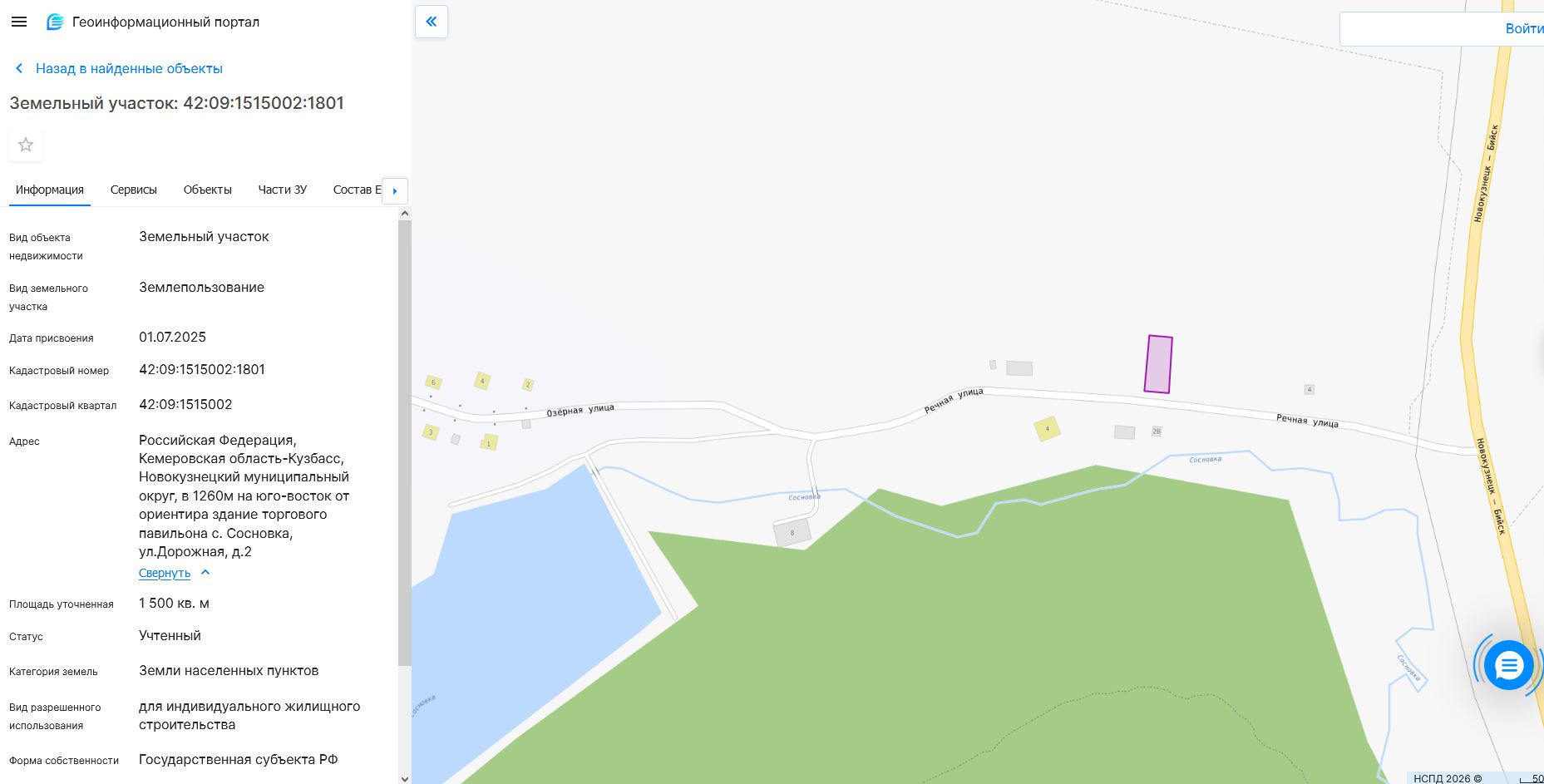 Земельный участок, пл.1500 кв.м, кадастровый №42:09:1515002:1801, разрешенное использование: для индивидуального жилищного строительства
