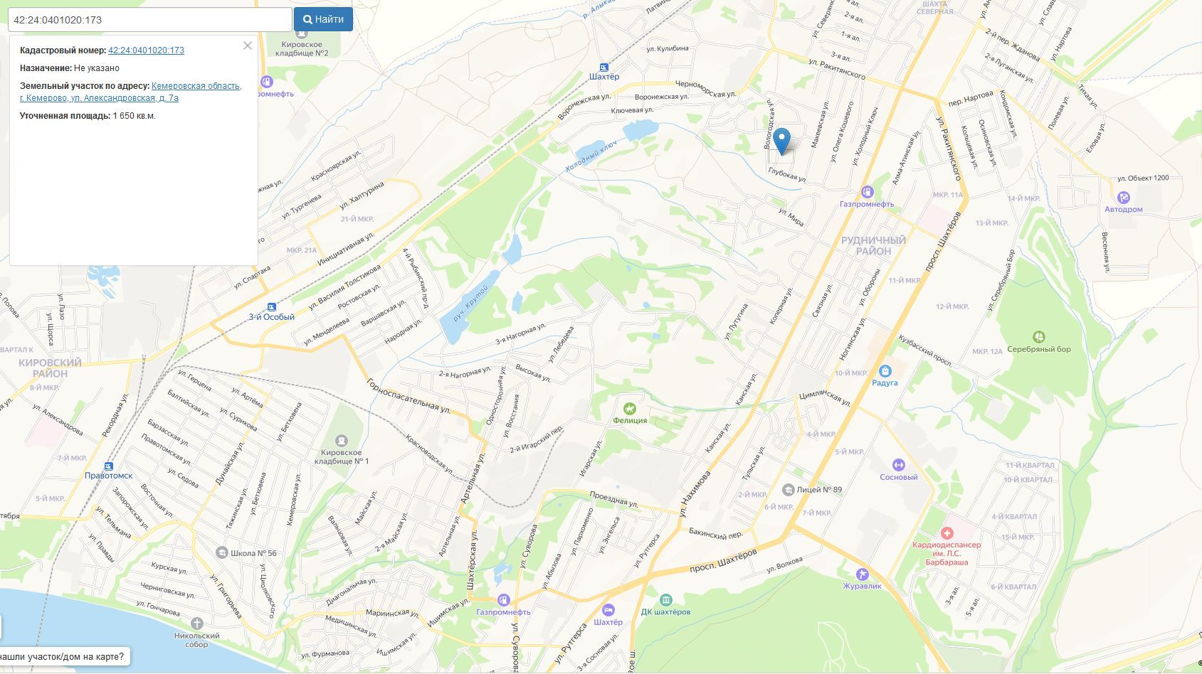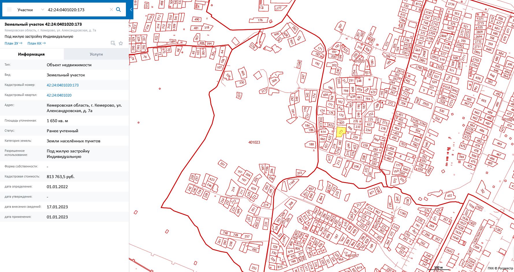 Земельный участок, пл.1650 кв.м, кадастровый №42:24:0401020:173, разрешенное использование: под жилую застройку индивидуальную. Срок аренды 20 лет