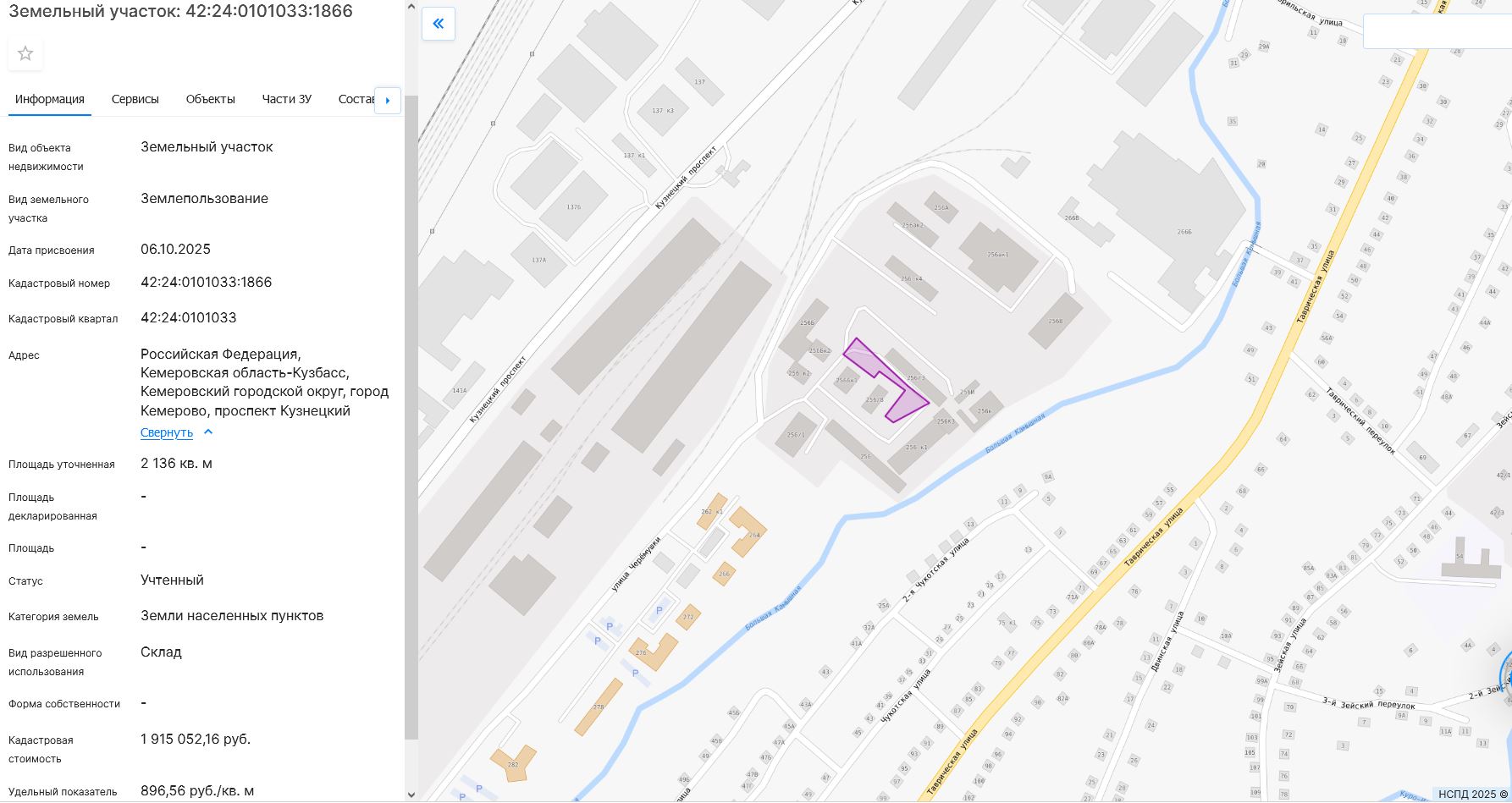 Земельный участок, пл.2136 кв.м, кадастровый №42:24:0101033:1866, разрешенное использование: склад. Срок аренды 88 месяцев