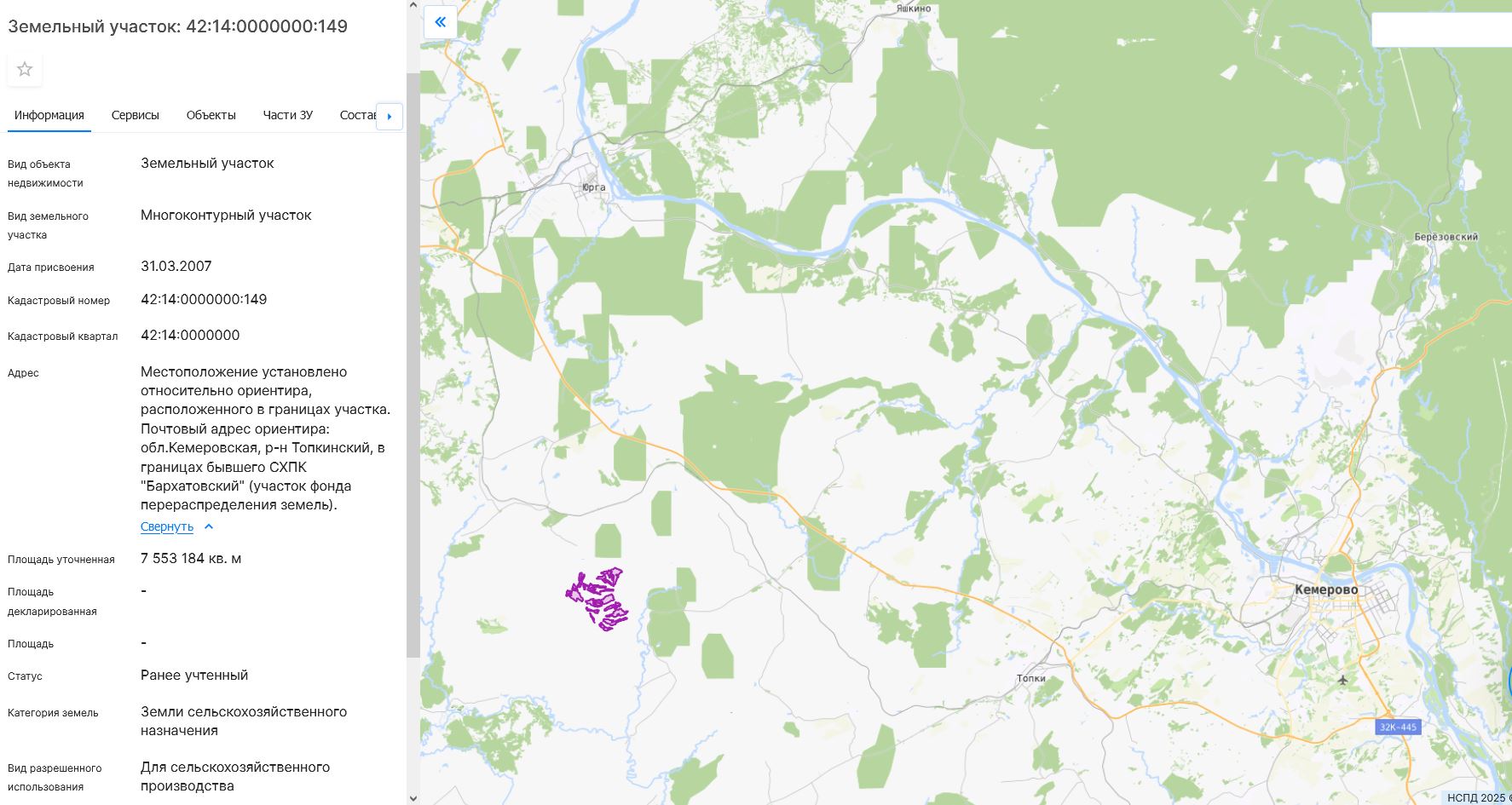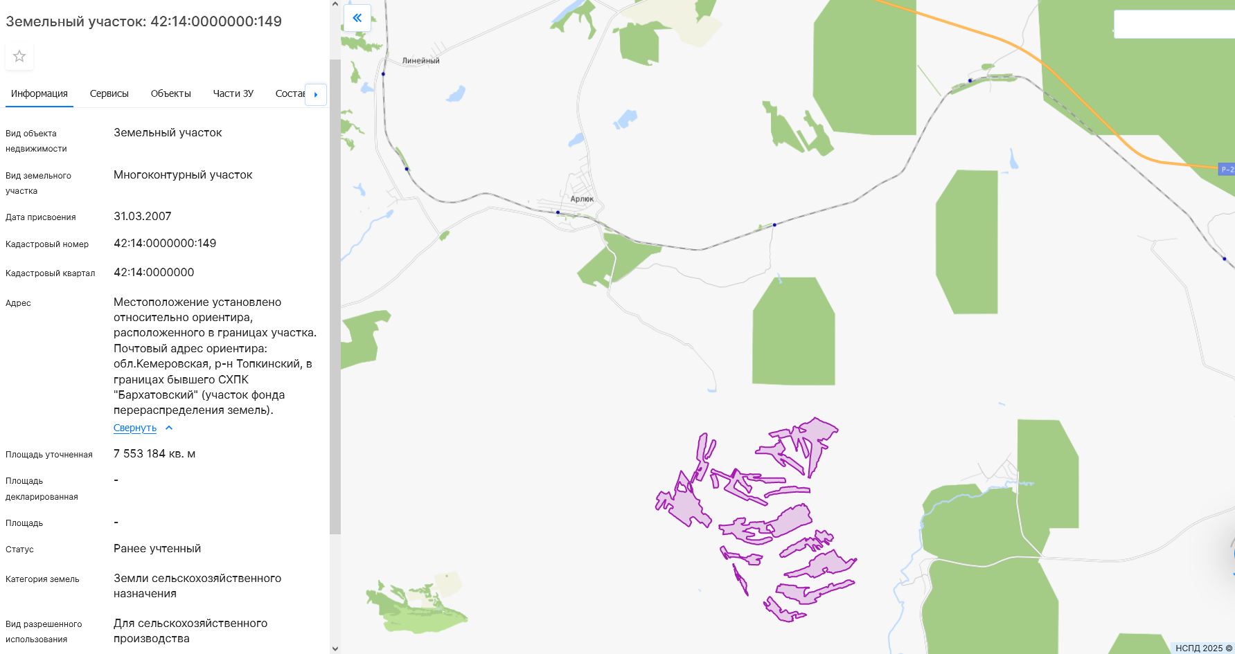 Земельный участок, пл.7553184 кв.м, кадастровый №42:14:0000000:149, разрешенное использование: для сельскохозяйственного производства. Срок аренды 5 лет