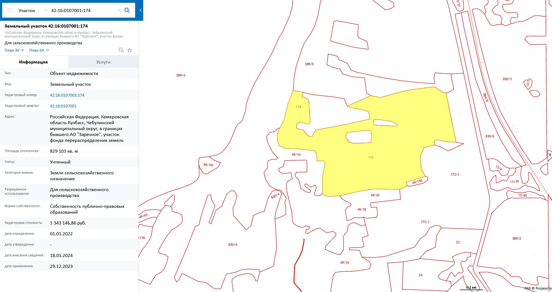 Земельный участок, пл.829103 кв.м, кадастровый №42:16:0107001:174, разрешенное использование: для сельскохозяйственного производства. Срок аренды 5 лет