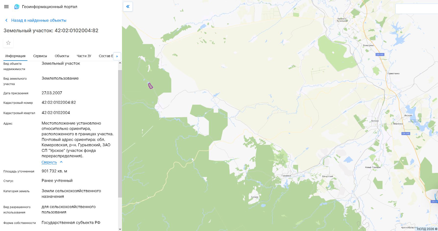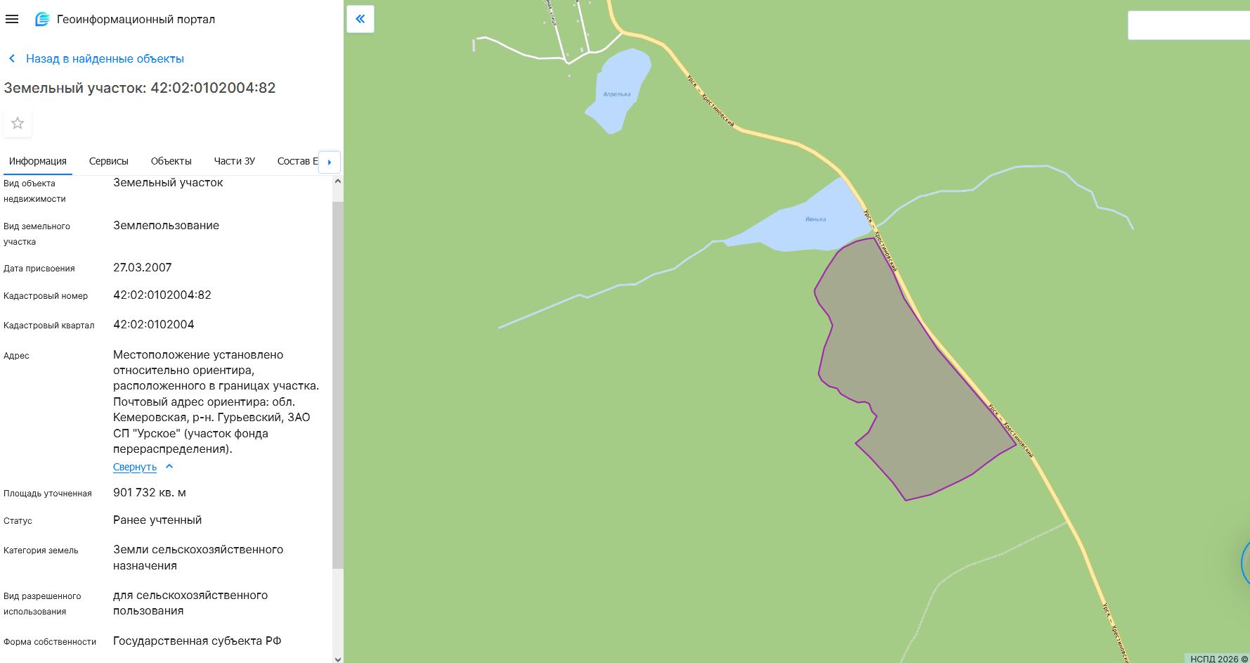 Земельный участок, пл.901732 кв.м, кадастровый №42:02:0102004:82, разрешенное использование: для сельскохозяйственного пользования. Срок аренды 5 лет