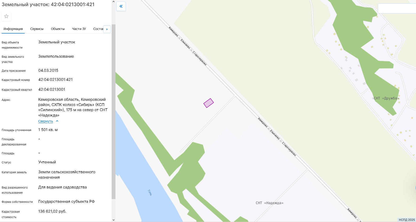 Земельный участок, пл.1501 кв.м, кадастровый №42:04:0213001:421, разрешенное использование: для ведения садоводства