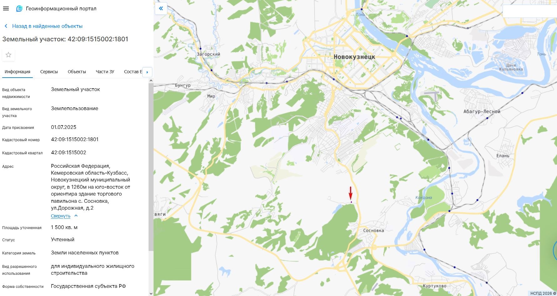 Земельный участок, пл.1500 кв.м, кадастровый №42:09:1515002:1801, разрешенное использование: для индивидуального жилищного строительства